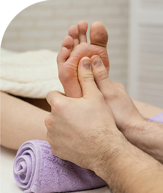 Herbal oil is applied to each of the feet's marma points in an Ayurvedic foot care therapy. Through activating the foot marma points, connections are formed at the most subtle level of the nerve system to facilitate the discharge of emotional stress.
