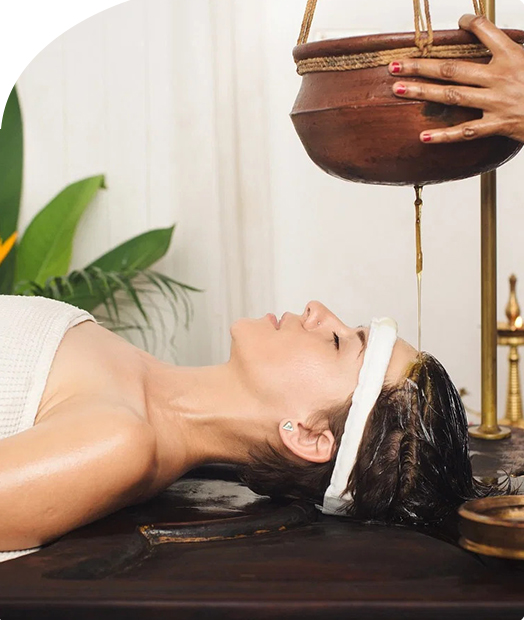 Shirodhara is a special type of traditional medicine in which oil is applied to the forehead at a precise height and for a predetermined amount of time, continuously and uniformly in a rhythmic manner. This allows the oil to flow through the scalp and into the hair in a rhythmic manner, stimulating your mind and body that produces a very calming effect. It acts upon the cerebral system, aids in nervous system relaxation, and maintains the equilibrium of Prana Vayu throughout the head.